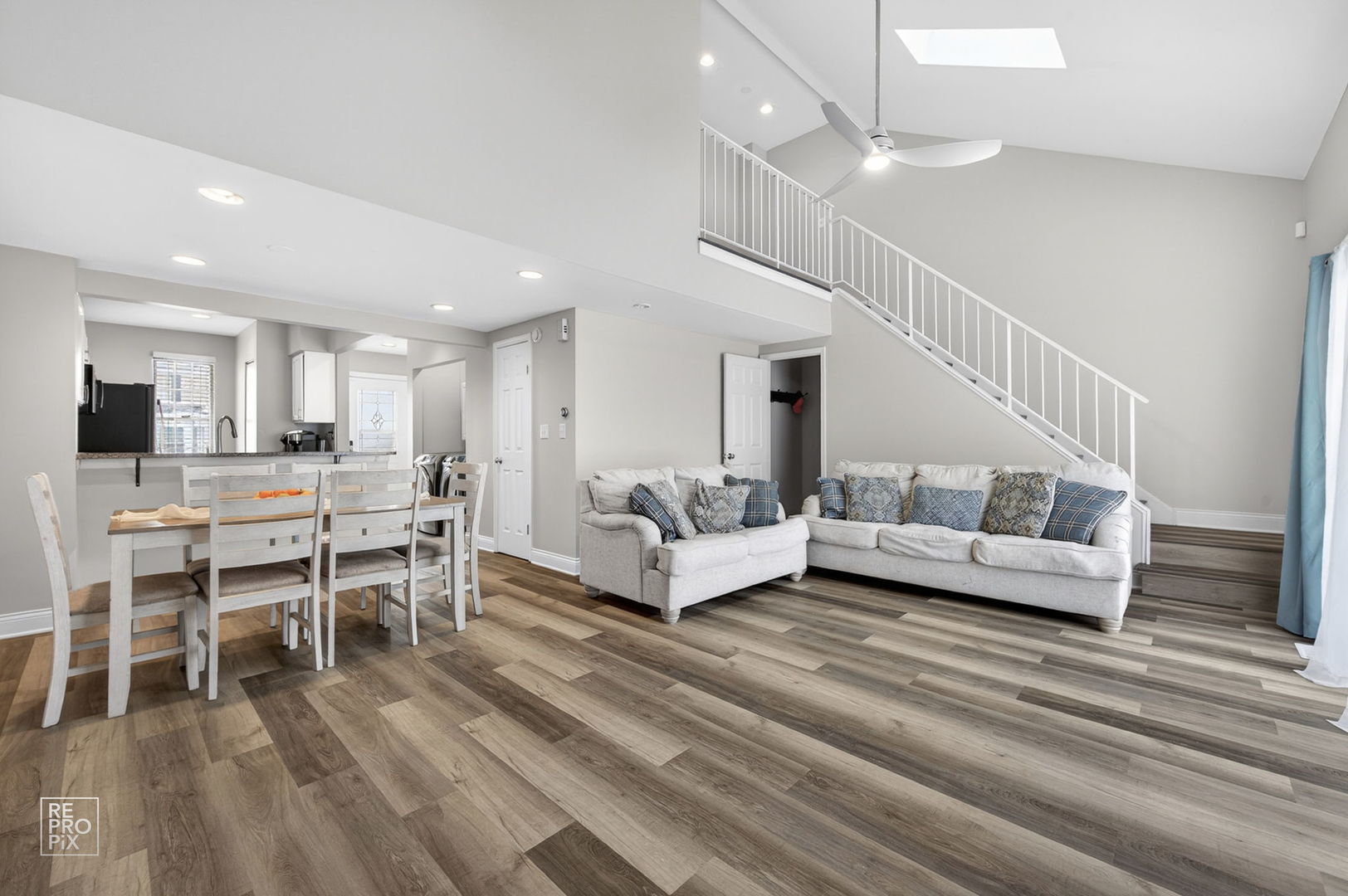 Move in ready- 2 story townhouse with finished basement. This 2 Bed/1.1 Bath unit features modern, bright interior with open floor plan, laminate wood floors throughout, updated kitchen with stainless steel appliances, granite countertops, breakfast bar, repainted cabinetry, skylights, newer washer & dryer, living room with wood burning fireplace, vaulted ceilings, and sliding glass door opening up to oversized deck with beautiful open views. Upstairs with large primary bedroom, and updated bathroom with huge glass walk-in shower and granite vanity. Finished basement has wood laminate flooring throughout, large living space, and bonus room that makes the perfect home office. One-car attached garage included and right by Green Meadows Golf Club!